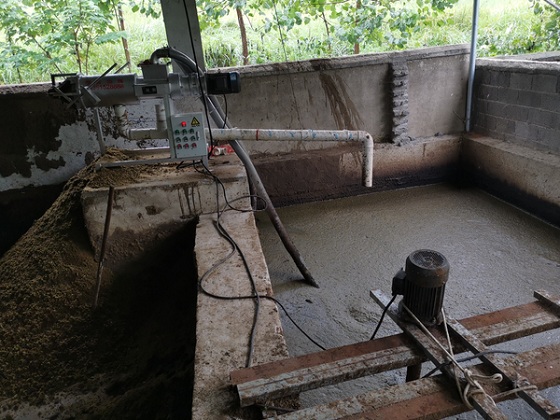 牛糞專用無堵塞切割泵將牛糞跟汙水一起抽進處理機內,再由不鏽鋼擠壓絞龍將牛糞汙水逐漸推向機體前方,同時不斷提高前緣的壓力, 迫使物料中的水分在邊壓帶濾的作用下擠出網篩,流出排水管。牛糞處理機工作是連續的, 其物料不斷泵入機體,前緣的壓力不斷增大,當大到一定程度時, 就將卸料口頂開, 擠出出料口,達到擠壓出料的目的。為了掌握出料的速度與含水量, 可以調節主機兩邊配重塊的位置,以達到滿意適當的出料態。